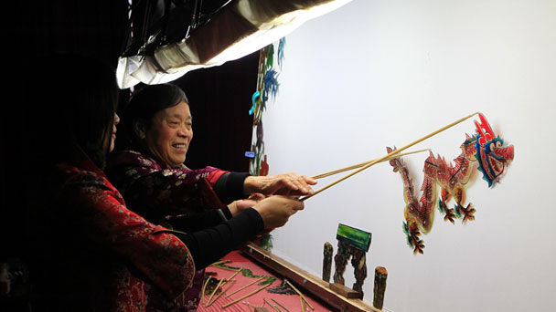 11月20日,在浙江海寧市南關廂歷史街區(qū),張坤榮(右)在指導徒弟練習舞龍。新華社記者 朱唯希 攝  11月20日,在浙江海寧市南關廂歷史街區(qū),張坤榮在表演皮影戲前做準備。新華社記者 朱唯希 攝  11月20日,在浙江海寧市南關廂歷史街區(qū),張坤榮(左三)在表演皮影戲。