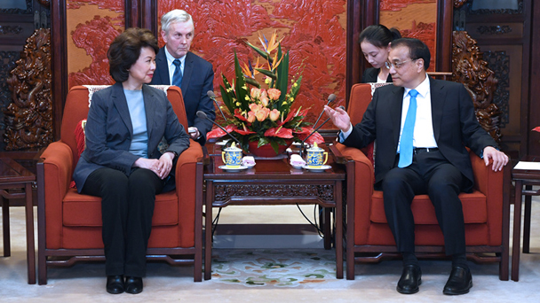 國務院總理李克強4月26日下午在中南海紫光閣會見來華訪問并出席中美交通論壇第九次會議的美國運輸部長趙小蘭。