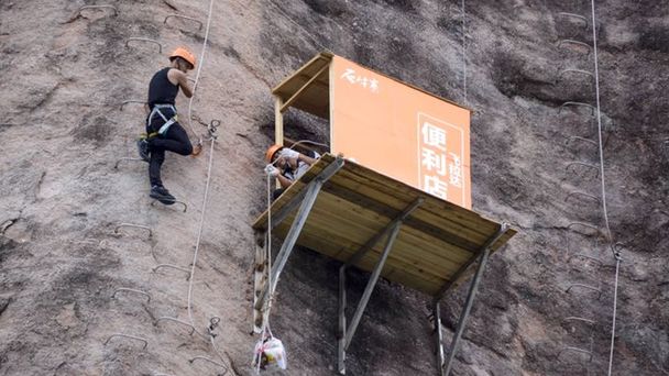 懸崖峭壁開小賣部 游人飛檐走壁買水喝