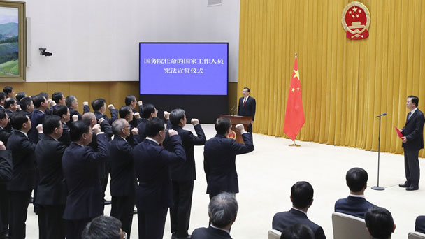 4月16日,新一屆國務(wù)院在北京中南海舉行憲法宣誓儀式。國務(wù)院總理李克強(qiáng)監(jiān)誓。