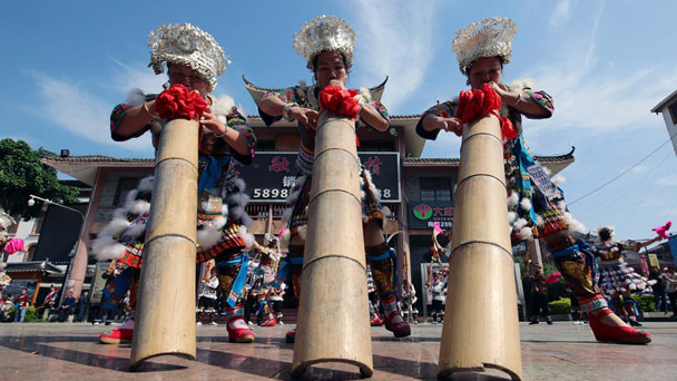 4月17日,在廣西融水苗族自治縣舉行的“壯族三月三·體育民族炫”系列活動(dòng)開幕式上,少數(shù)民族同胞參加拉苗鼓比賽。