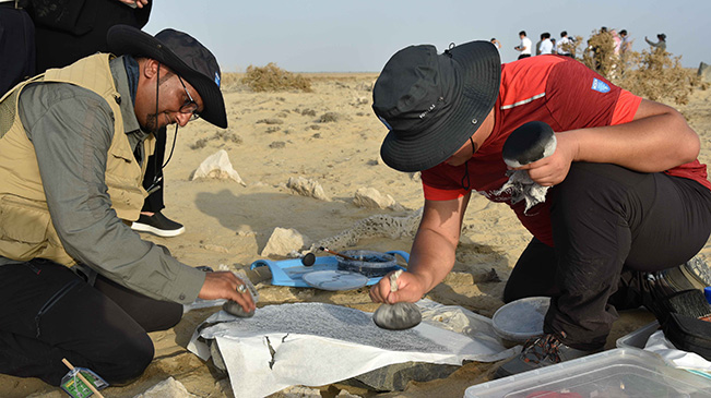 4月5日,中沙考古隊(duì)員在沙特阿拉伯塞林港遺址展開工作。新華社記者王波攝  4月5日,在沙特阿拉伯塞林港遺址,中沙聯(lián)合考古隊(duì)的中方領(lǐng)隊(duì)姜波(中)展示考古發(fā)現(xiàn)的阿拉伯釉陶。新華社記者王波攝  4月5日,在沙特阿拉伯塞林港遺址,考古隊(duì)員展示發(fā)現(xiàn)的中國(guó)青花瓷片。