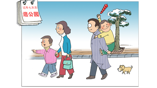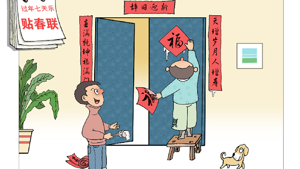 過年七天樂——貼春聯。每逢春節,家家戶戶都在門上貼春聯和福字,辭舊迎新。