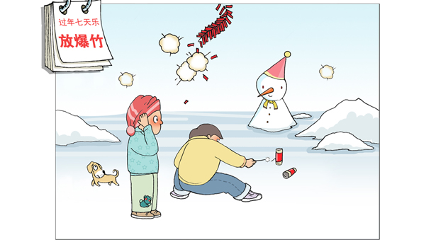 過年七天樂——放爆竹。中國民間有“開門爆竹”一說。即在新的一年到來之際,家家戶戶開門的第一件事就是燃放爆竹,以嗶嗶叭叭的爆竹聲除舊迎新,驅趕年獸。