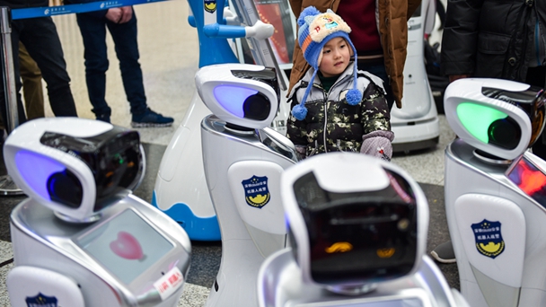 當日,為加大對違法犯罪的打擊力度,確保旅客出行安全,深圳鐵路警方聯合深圳市人工智能行業協會在深圳北站投入20臺警用機器人,組成機器人警察編隊,為春運保駕護航。   2月7日,警用機器人在深圳北站出發大廳“巡邏”。