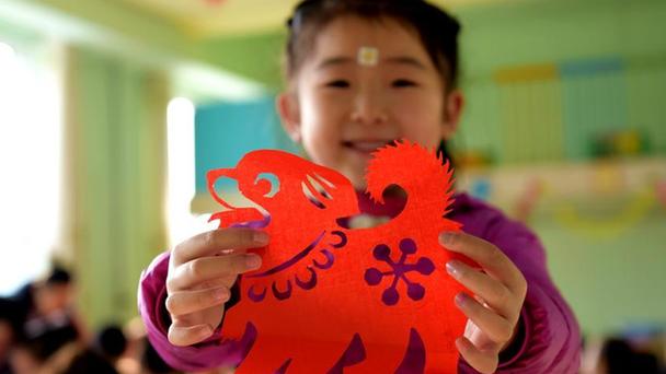 2月4日,河北省衡水市冀州區第一幼兒園的小朋友在當地剪紙藝人的指導下,學習制作以生肖“狗”為主題的剪紙作品,迎接農歷狗年春節。