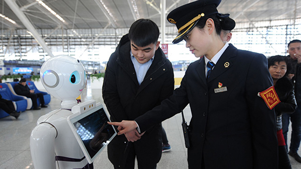2月3日,在青島北站候車室,旅客通過問詢機器人“小路”查詢信息。近日,一臺集合人機交互、人工智能、大數據等多項新技術的問詢機器人“小路”亮相山東青島北站候車室,為旅客提供車次、檢票口、餐飲、問路指引等多項語音問詢及查詢服務,為春運中的旅客帶來便利。新華社發(王海濱 攝)  2月3日,在青島北站候車室,一名小朋友好奇地看著問詢機器人“小路”。
