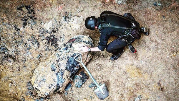 1月27日,警員在檢查炸彈。當日,香港警方表示,香港灣仔會展中心一工地地底發現戰時遺留的空投炸彈,炸彈約1000磅。目前香港灣仔附近已有1300人被疏散。新華社發