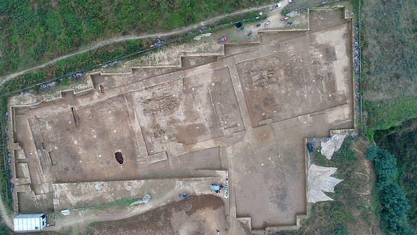 考古人員展示秦咸陽城胡家溝建筑遺址出土的帶有“樂府”字樣的石磬(1月24日攝)。新華社記者 李一博 攝  陜西考古研究院助理研究員張楊力錚介紹秦咸陽城胡家溝建筑遺址出土的石磬(1月24日攝)。