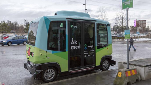 這是1月24日在瑞典首都斯德哥爾摩拍攝的一輛試運行的無人駕駛巴士。
