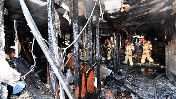 1月26日,在韓國慶尚南道密陽市,消防人員在被燒毀的醫院內工作。韓國慶尚南道密陽市一家醫院26日火災死亡人數已經升至37人,傷者超過100人。韓國慶尚南道密陽市一家醫院26日火災死亡人數已經升至37人,傷者超過100人。