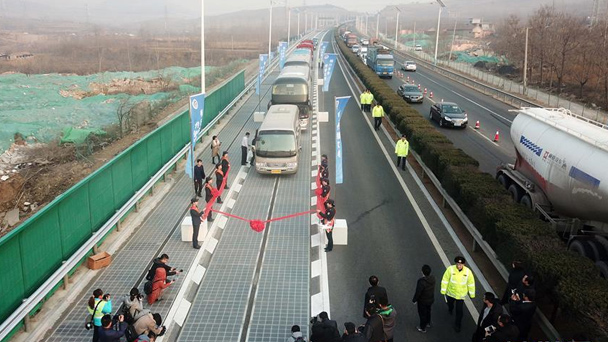 當(dāng)日,我國首個承載式光伏高速公路試驗段在濟(jì)南建成通車,實現(xiàn)利用高速公路路面并網(wǎng)發(fā)電。光伏路面鋪設(shè)長度1080米、凈面積5875平方米,鋪設(shè)主行車道和應(yīng)急車道;分布式光伏并網(wǎng)發(fā)電裝機(jī)容量峰值功率817.2千瓦,預(yù)計可實現(xiàn)年發(fā)電量約100萬千瓦時。