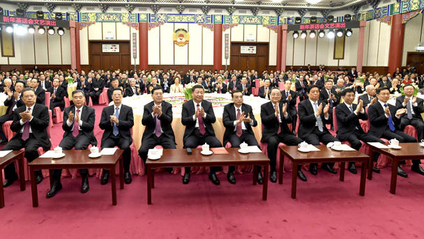 12月29日,全國政協(xié)在北京舉行新年茶話會。黨和國家領(lǐng)導(dǎo)人習(xí)近平、李克強(qiáng)、張德江、俞正聲、張高麗、栗戰(zhàn)書、汪洋、王滬寧、趙樂際、韓正出席茶話會并觀看演出。