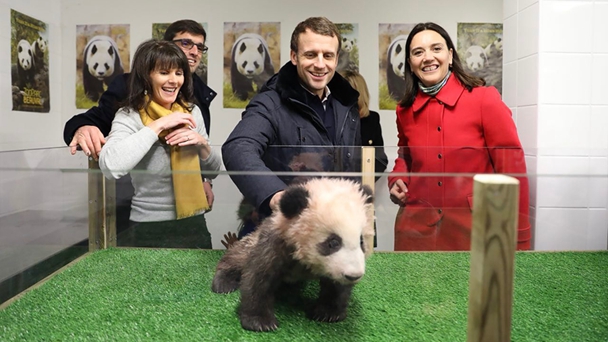 12月16日,在法國圣艾尼昂市博瓦勒野生動物園,法國總統馬克龍(前中)參觀大熊貓寶寶“圓夢”。博瓦勒野生動物園16日發布公告說,法國總統馬克龍當天下午和家人一同來到動物園,參觀了大熊貓寶寶“圓夢”。