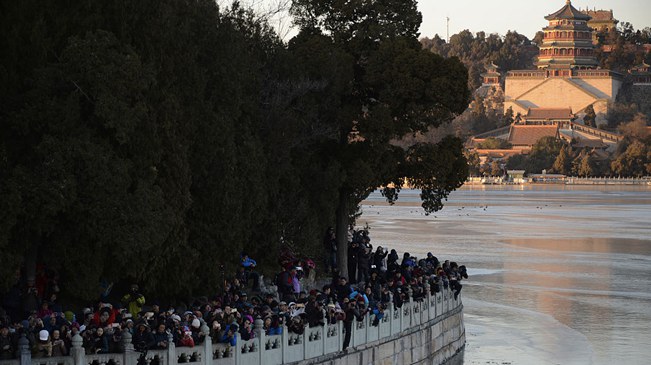攝影愛好者齊聚頤和園拍攝“金光穿孔”