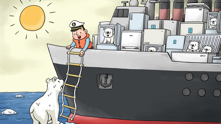 全球變暖如果持續(xù)下去,北極熊恐怕要在冰箱里求生存了。