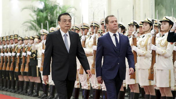 11月7日,國務(wù)院總理李克強在北京人民大會堂與俄羅斯總理梅德韋杰夫共同主持中俄總理第二十三次定期會晤。會晤前,李克強在人民大會堂北大廳為梅德韋杰夫舉行歡迎儀式。