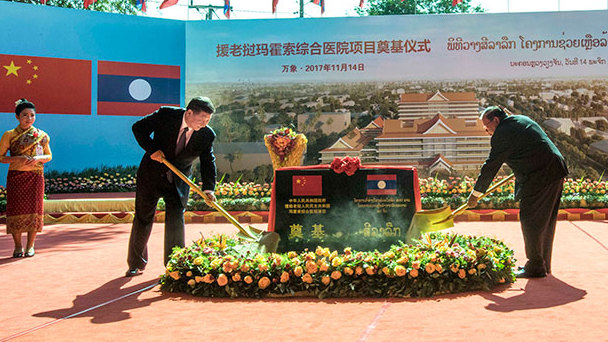 11月14日,中共中央總書記、國家主席習近平同老撾人民革命黨中央委員會總書記、國家主席本揚在萬象一道出席瑪霍索綜合醫(yī)院奠基儀式。