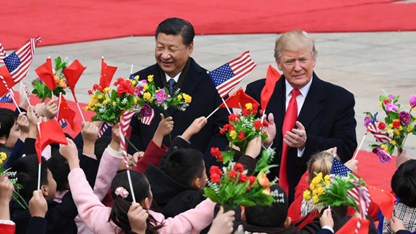 11月9日,國家主席習近平在人民大會堂同美國總統特朗普舉行會談。會談前,習近平在人民大會堂東門外廣場為特朗普舉行歡迎儀式。