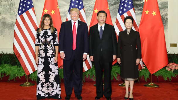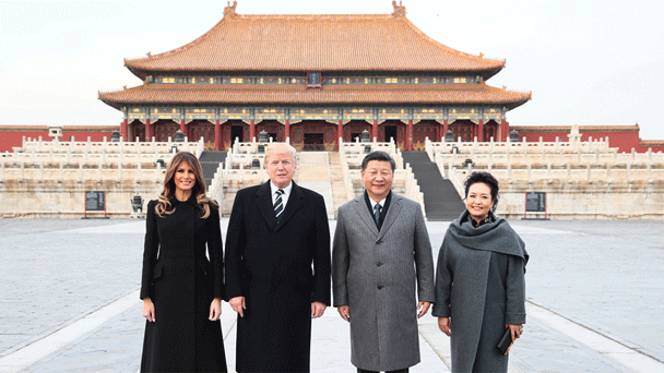 11月8日,國家主席習近平和夫人彭麗媛陪同來華進行國事訪問的美國總統特朗普和夫人梅拉尼婭參觀故宮博物院。