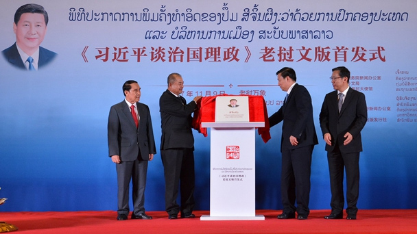 11月9日,在老撾首都萬象,中國國務院新聞辦公室副主任郭衛民、老撾人民革命黨中央書記處書記、中宣部長吉喬等出席《習近平談治國理政》老撾文版首發式。