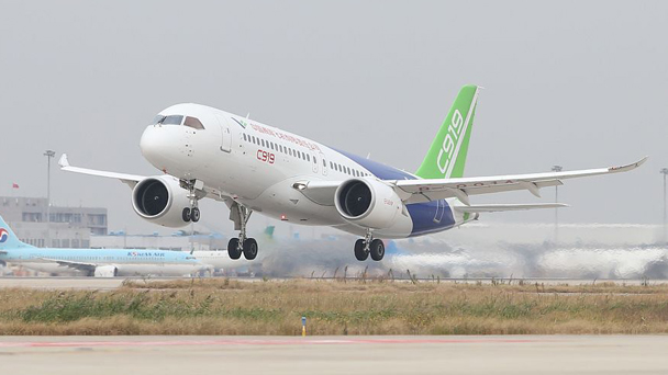 2017年11月10日,上海,國產大飛機C919起飛前往西安閻良。這是C919的首次遠距離飛行。