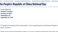 在中華人民共和國即將迎來建國六十九周年之際,當(dāng)?shù)貢r間9月27日,美國國務(wù)卿邁克·蓬佩奧送來祝福。
