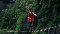 驚險!張家界天門山舉行女子高跟鞋走扁帶比賽