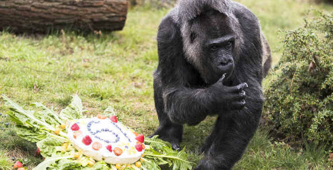 世界最老大猩猩迎來61歲生日 安詳吃蛋糕淡定自如