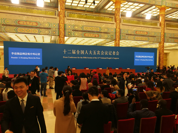 3月15日上午十二屆全國人大五次會議閉幕后,國務院總理李克強在人民大會堂三樓金色大廳會見采訪十二屆全國人大五次會議的中外記者并回答記者提出的問題。
