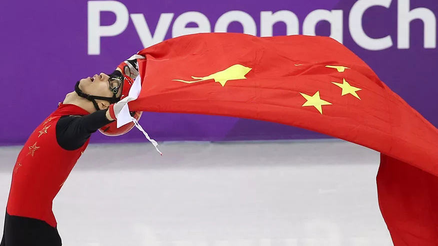 2月23日,2018平昌冬奧會舉行短道速滑男子500米頒獎儀式,中國選手武大靖登臺領獎,五星紅旗在現(xiàn)場冉冉升起。