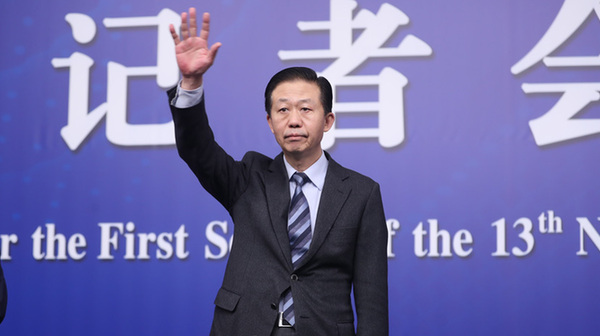 十三屆全國人大一次會議新聞中心于3月7日上午在梅地亞中心多功能廳舉行記者會。財政部部長肖捷向記者舉手示意。