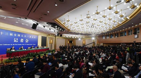 十三屆全國人大一次會議新聞中心于3月7日上午在梅地亞中心多功能廳舉行記者會,圖為肖捷與記者互動。