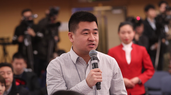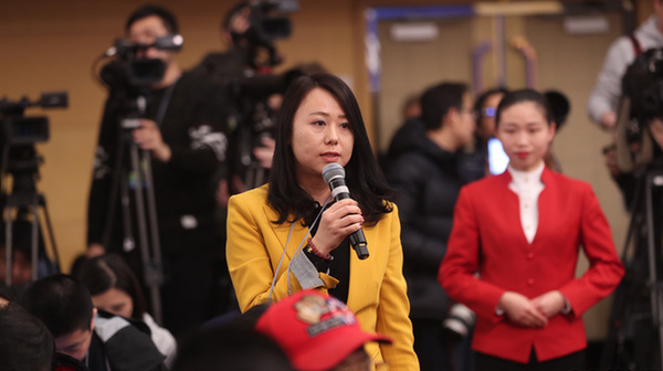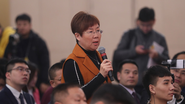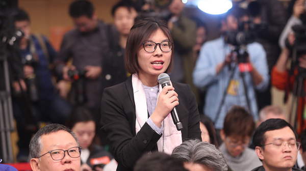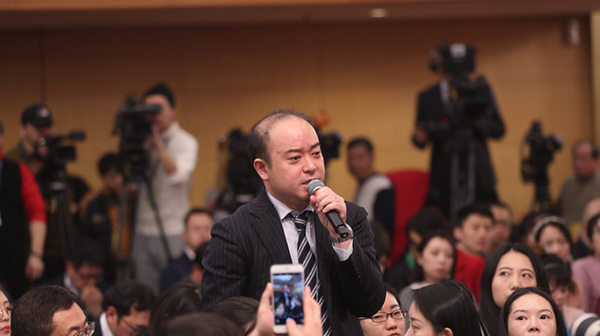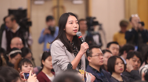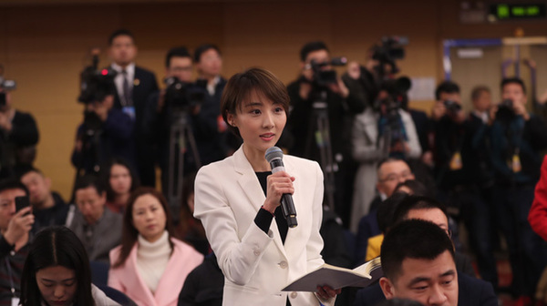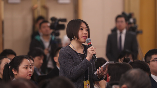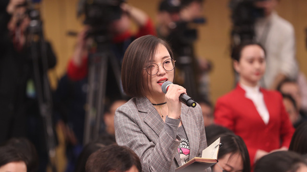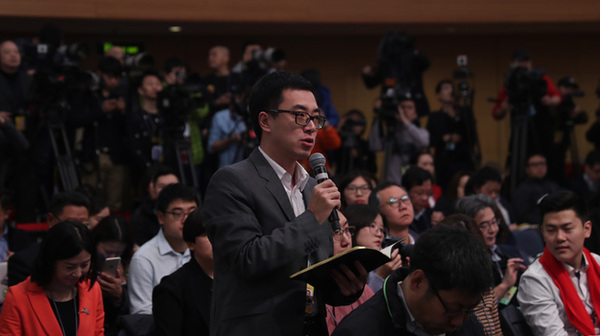 十三屆全國人大一次會議新聞中心于3月7日上午在梅地亞中心多功能廳舉行記者會,邀請財政部部長肖捷,副部長史耀斌、胡靜林就“財稅改革和財政工作”相關問題回答中外記者提問。圖為中國日報記者提問。