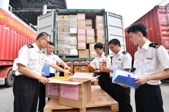 隨著調度員一聲哨響,三輛滿載貨物的集裝箱貨車緩緩通過關口。這是第15屆中國—東盟博覽會來自印尼和馬來西亞的首批參展品入關。