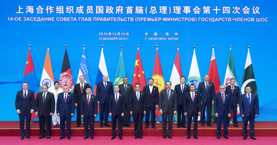 15日上午,李克強總理在鄭州國際會展中心與出席上海合作組織成員國政府首腦(總理)理事會第14次會議的成員國、觀察員國領導人和國際組織負責人集體合影。